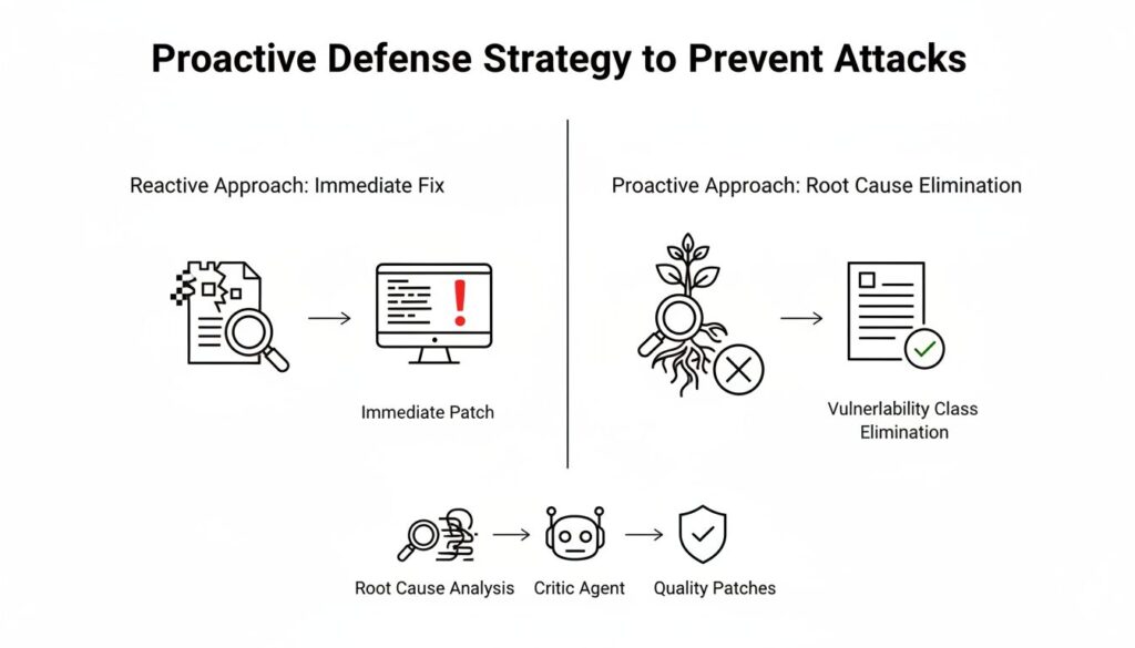 そして、より重要かつ革新的なのが「プロアクティブ(積極的)」なアプローチです。これは、特定のバグを一つひとつ修正するのではなく、脆弱性が生まれる根本的な原因を特定し、その「脆弱性のクラス(種類)」全体を排除するようにコードを書き換えるアプローチです。