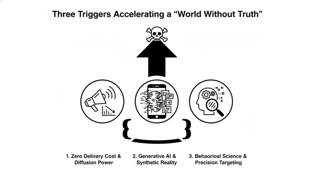 Gartnerの新刊『World Without Truth』は、その元凶となる3つのトリガーを指摘しています。これらが複雑に絡み合い、従来型の対策を過去のものにしています。