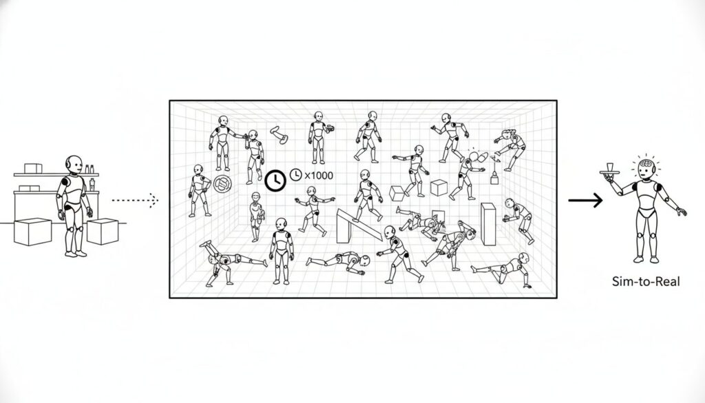 この閉鎖空間の中で、数百万台の仮想ロボットが同時に、かつ現実の数千倍の速度で試行錯誤を繰り返す。現実の1秒が、仮想空間では数年分の経験値に変換されます。
