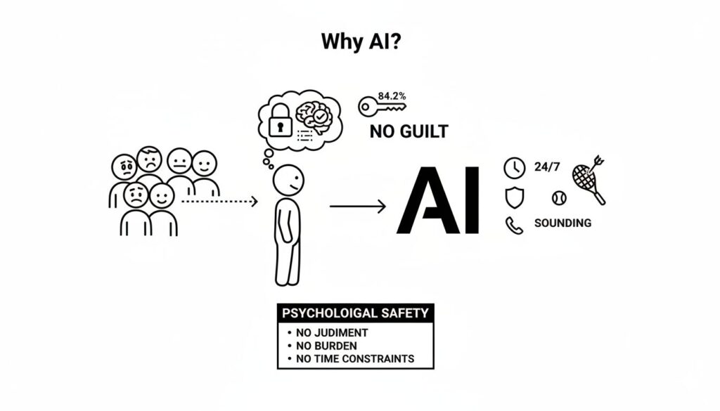 この調査で最も興味深いシグナルは、自己理解目的でAIを利用した人のうち、84.2%もの人が「身近な人には相談しにくい内容をAIに相談した経験がある」と回答している点です。