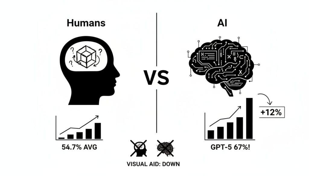 - 人間超えの性能: 視覚イメージが必須とされたタスクで、最新LLM(GPT-5)が人間の平均スコアを12%以上も上回った。