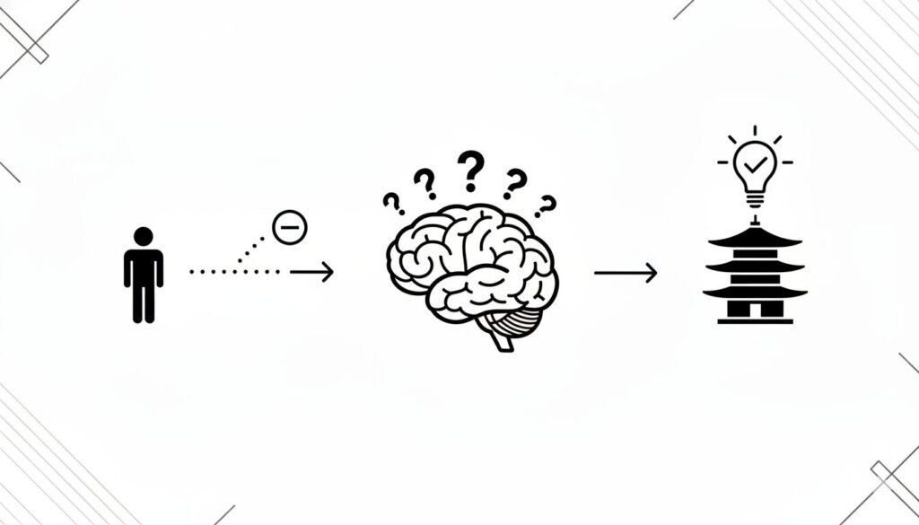 ひらめきが求められる問題では、私たちは無意識に作った思考の枠組みに行き詰まります(インパス状態)。この壁を乗り越える鍵が、認知科学で「表象の再構成(Representational Change)」と呼ばれるプロセスです。