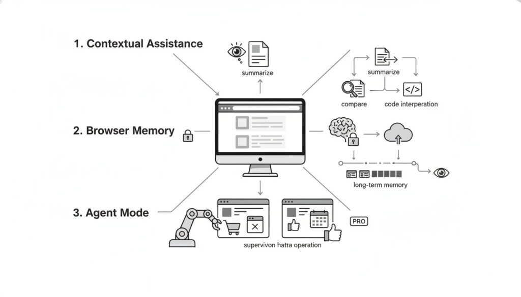 ChatGPT Atlasの提供価値は、以下の3つの機能の有機的な連携によって成り立っています。