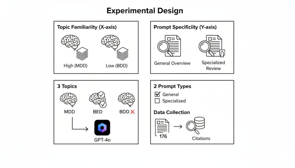 彼らはこれら3つの疾患に対し、「一般的な概要(症状や治療法)」と「専門的なレビュー(デジタル介入のエビデンス)」という2つのレベルで文献レビューの作成を指示しました。生成された合計176件の引用文献について、Google ScholarやScopusなどのデータベースを駆使し、実在するかどうかを徹底的に追跡調査したのです。