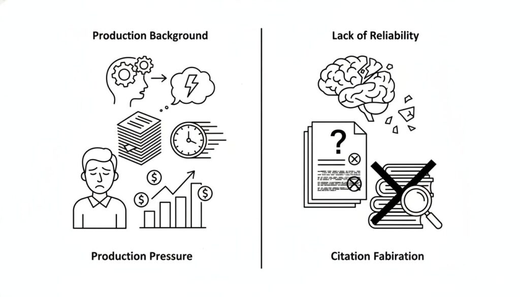 特に深刻なのが、実在しない論文をAIが生成してしまう「引用捏造」です。研究論文において、引用は議論の正当性を担保する証拠そのものです。もし証拠が捏造されたものであれば、その上に構築された論理はすべて無効となります。