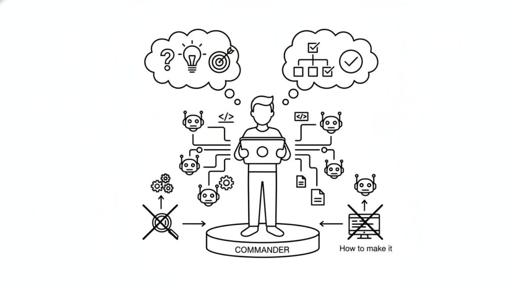 求められるのは、プロジェクト全体の目標を、AIが実行可能なタスク群へと分解し、最適なAIを割り当て、最終的な成果物を統合・評価する能力です。役割は「実装者」から「AIの指揮官」へと明確にシフトします。
