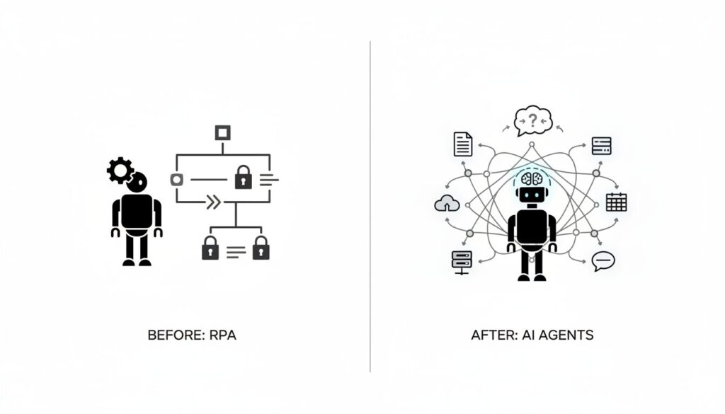 では、「AIエージェント」とは何でしょうか?これは、特定の目的や役割を与えられ、自律的に思考し、複数のアプリケーションを横断してタスクを実行するAIプログラムです。従来のRPA(Robotic Process Automation)が決められた手順をなぞるだけの「ロボット」だったのに対し、AIエージェントは状況を判断し、最適なアクションを自ら決定する「知能」を持っています。
