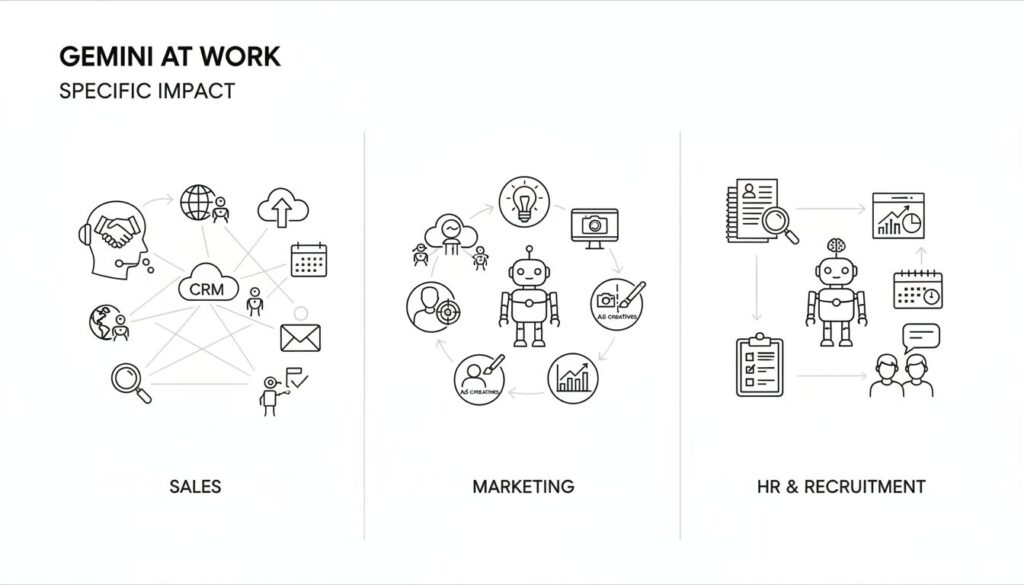 Googleが掲げる「Gemini at Work」構想は、絵空事ではありません。各部門で、具体的に以下のような変革が起こり得ます。