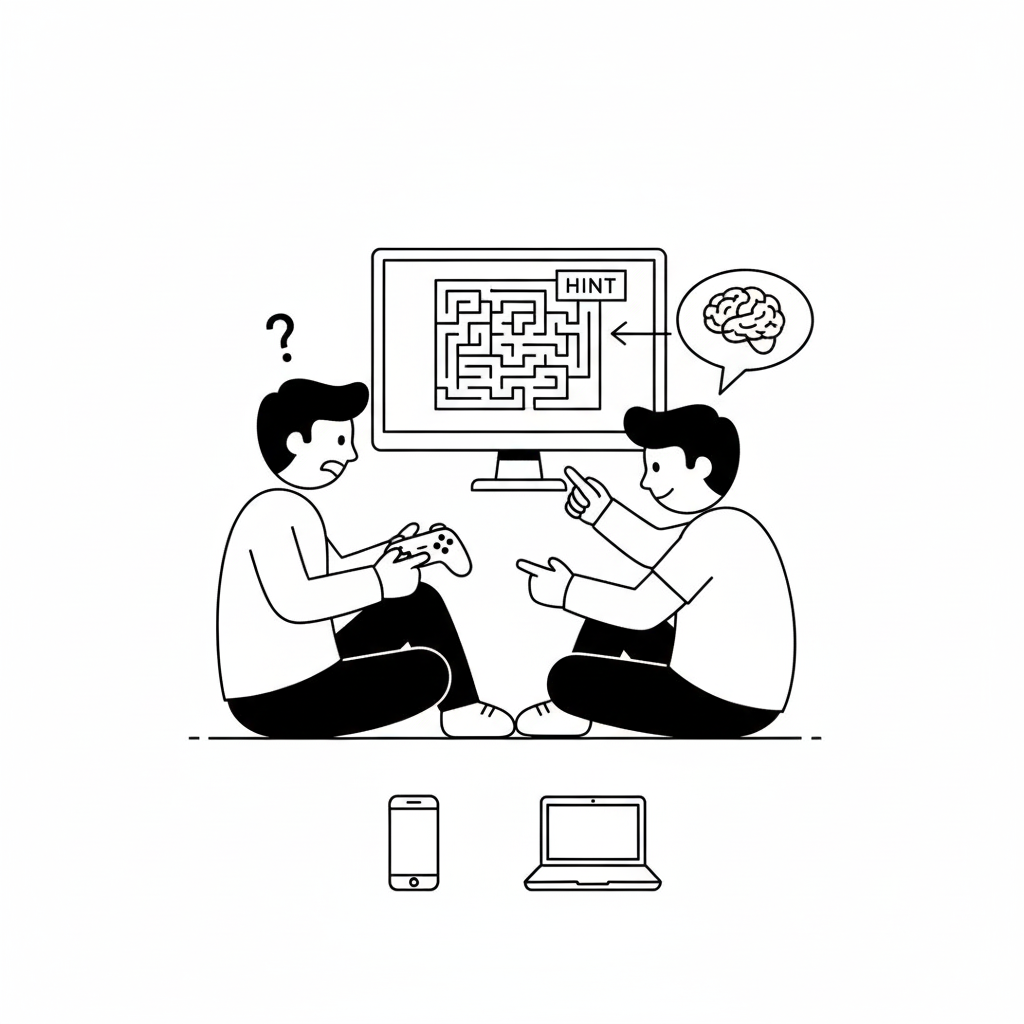 - 謎解き・パズルゲーム: 複雑なギミックに対し、答えそのものではなく思考を助けるヒントを段階的に示します。