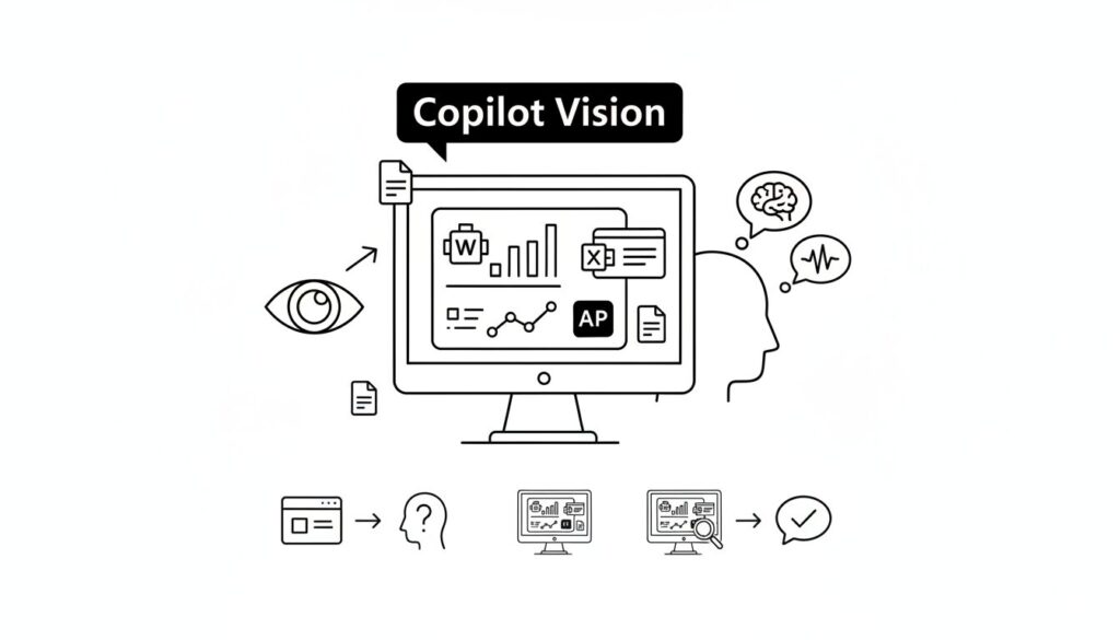 「Copilot Vision」は、AIがユーザーと同じPC画面を「見る」ことで、表示されている内容の文脈(コンテキスト)を理解する技術です。これにより、AIは抽象的な命令だけでなく、具体的な視覚情報に基づいた対話と支援が可能になります。
